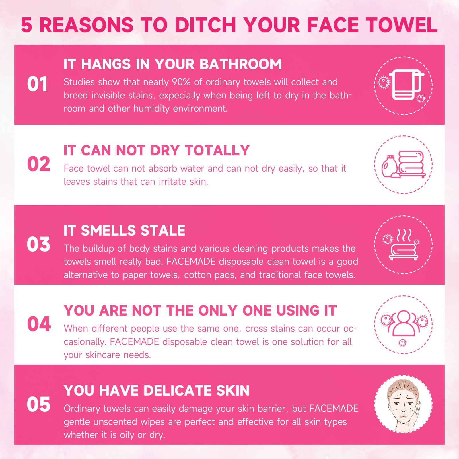 - One time use: Reusing ordinary towels will accumulate and spread dirty even if they are dried after one use! But with FACEMADE disposable face towels, you will get clean towels every time. Please rest assured that you will have a comfortable skincare journey.
